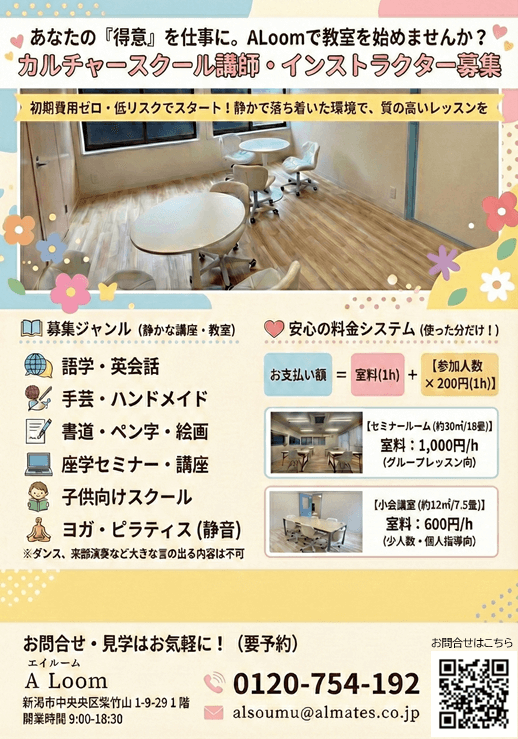 株式会社アルメイツはこの度、 ALoom(新潟市中央区紫竹山1丁目9-29 1F)を開設し、教育サービス事業を開始することとなりました。