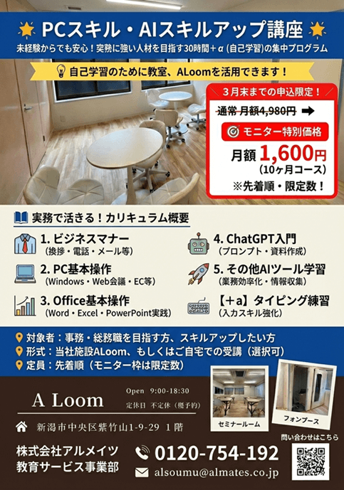 PC未経験の方、AIを学習したい方、事務職転換したい方にもおすすめです。