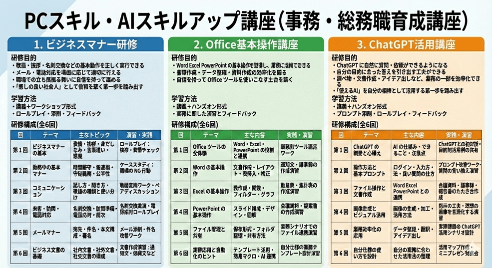 PCスキル・AIスキルアップを目的とし、ワード・エクセル・パワーポイントの学習やAIを活用した事務作業の効率化 また、AIを用いた画像作成や動画作成まで学習可能です。